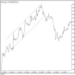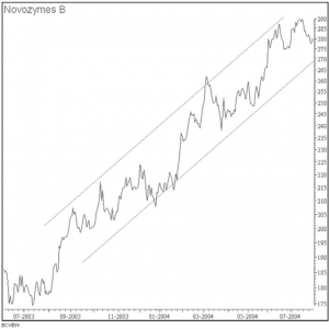 I figur 12.1 ser vi et eksempel på en stigende trendkanal. Det er Novozymes, som i perioden fra midten af 2003 til midten af 2004 steg med 50 %. Vi har illustreret trendkanalen med de to parallelle grå linjer.