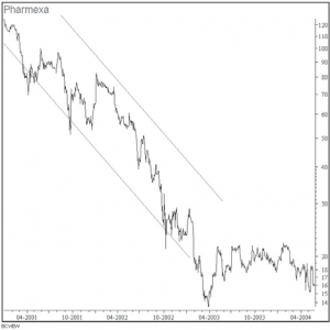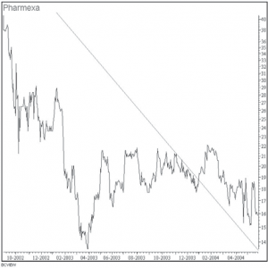 Pharmexa er et eksempel på det modsatte i forhold til Novozymes B. Se figur 12.2. Her har vi nemlig en aktie, som fra sin børsintroduktion i midten af 2000 og de