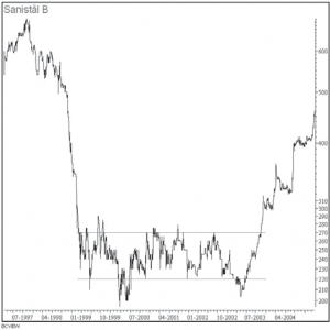 For Sanistål sluttede et kraftigt kursfald i slutningen af 1990’erne med en stabilisering i intervallet 220-270. Der var nogle enkelte sving uden for dette interval, men i