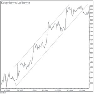 Yderligere et eksempel på et brud ned gennem bunden i en stigende trendkanal er Københavns Lufthavne,
